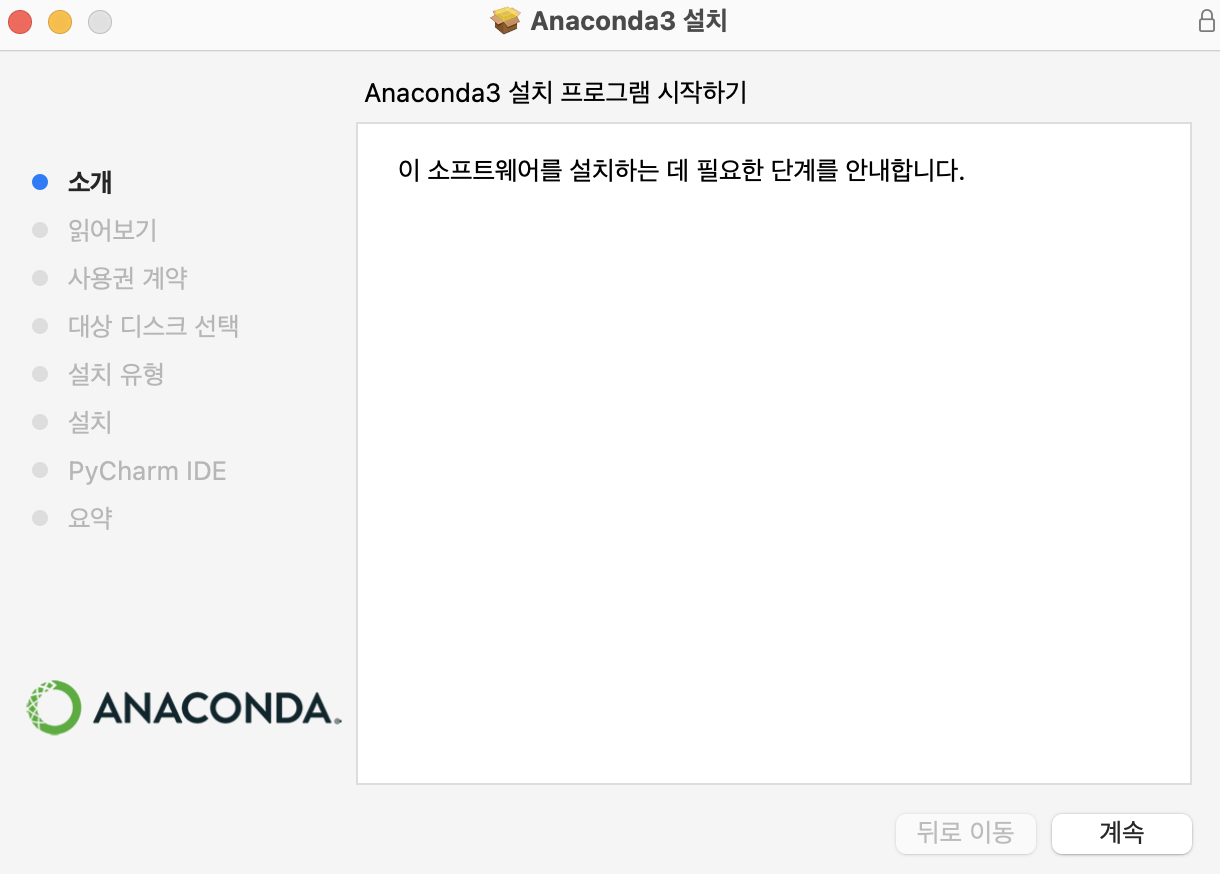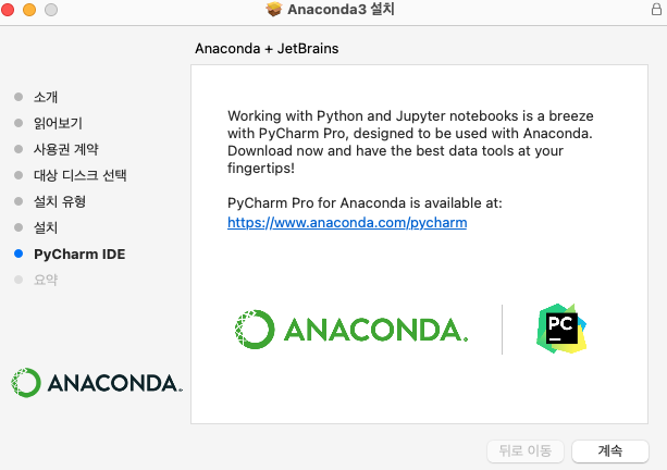 설치가 완료가 되면 Anaconda + JetBrains를 소개하는 화면이 나타나며, 계속을 클릭을 하여 완료를 합니다.