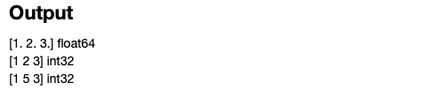 ndarray내의 데이터 타입은 같은 데이터 타입만 저장이되며, 한개의 ndarray 배열에 int와 float가 같이 있을 수 없습니다. ndarray내의 데이터 타입은 dtype을 사용하여 확인이 가능합니다.