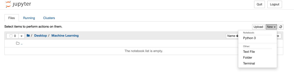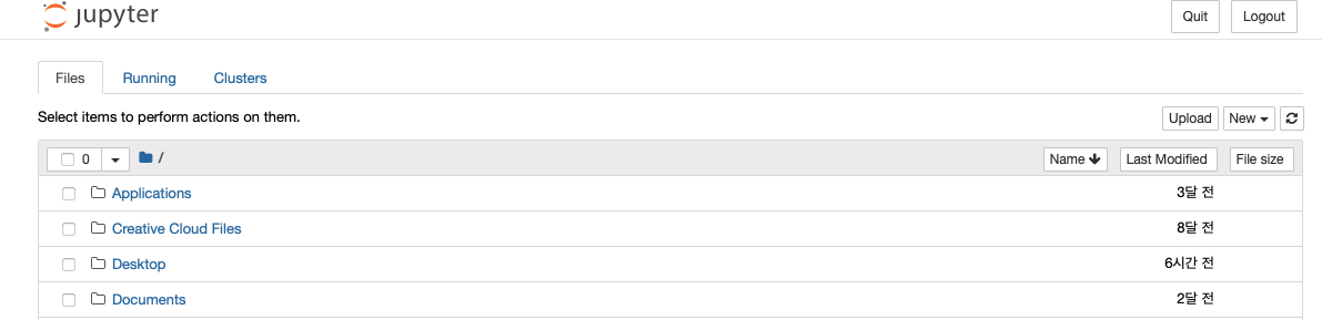 실행이 되면서 아래 그림과 같이 접속이 됩니다. (http://localhost:8888/tree)