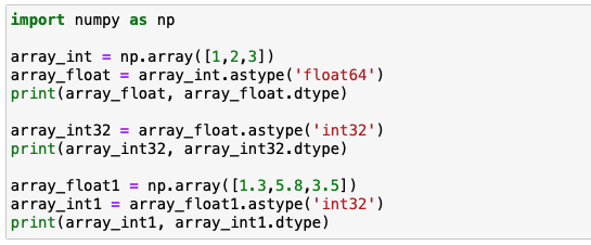 먼저 int형 ndarray를 생성 후, astype을 이용해서 float64로 변환하고, float64에서 int32로 변환을 하였습니다.