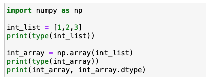 리스트인 int_list 에는 숫자인(int) 1,2,3의 값을 가지고 있습니다. 이를 ndarray로 변경을 하게 되면, ndarray에서는 변경된 값은 모두 int64형의 데이터 타입인것을 dtype을 통해서 확인이 가능합니다.