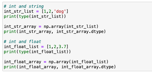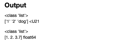int와 string이 같이있는 리스트는 int형의 값 1,2 가 모두 문자열 값인 '1', '2'로 변환이 되었습니다. 그리고 데이터 타입이 더 큰 타입으로 변경이 되어 유니코드 값으로 변경이 되었습니다.