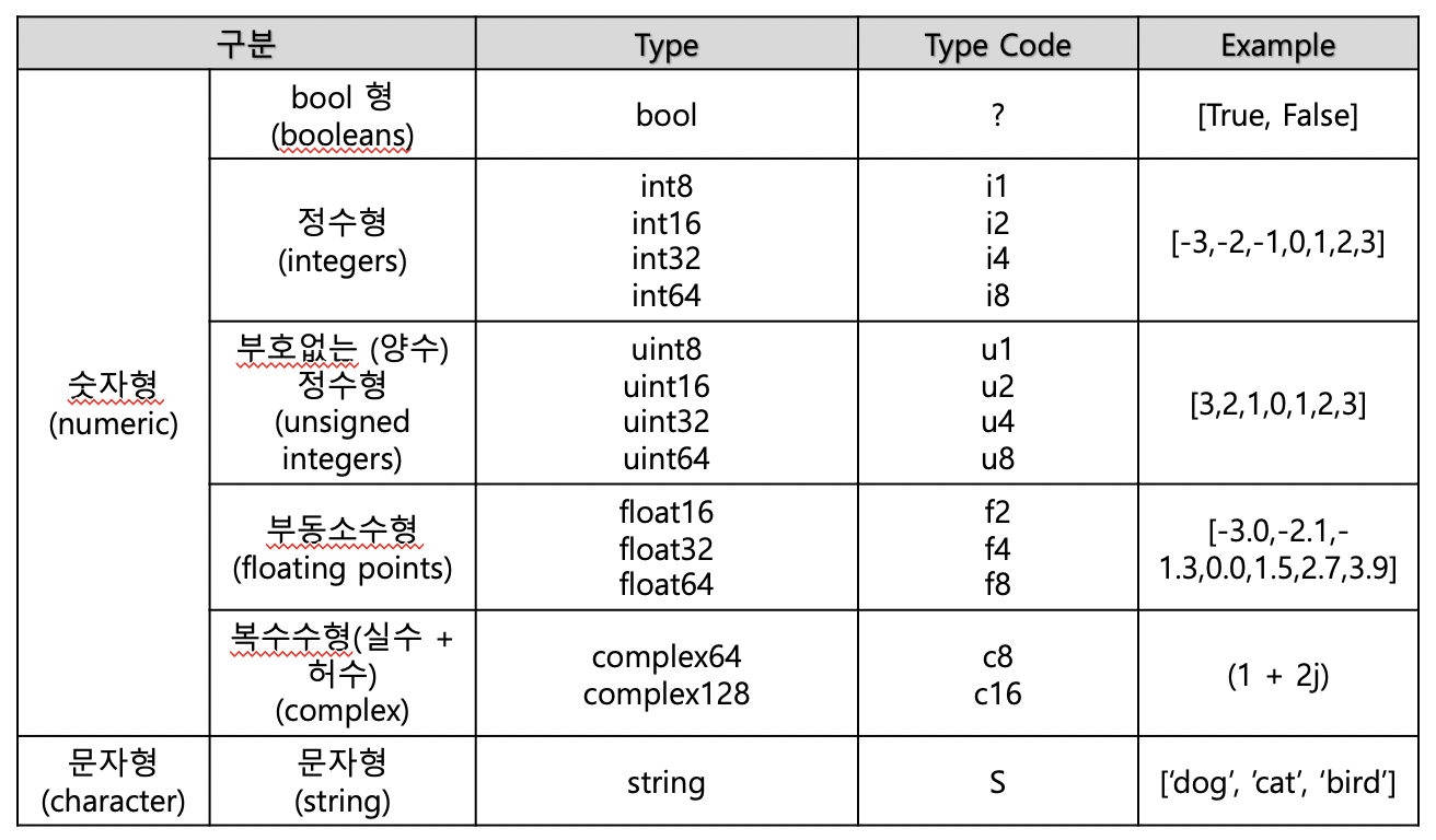 ndarray에 기입이 가능한 데이터 타입은 숫자, 문자열, 불 값 등 모두 가능합니다. ndarray는 dtype 형으로 저장이 되며 일반적으로 숫자형의 경우 int형(8bit, 16bit 32bit), unsigned int형(8bit, 16bit,32bit), float형(16bit, 32bit,64bit, 128bit)이 있습니다. 이 보다 더 큰 숫자 값이나 정밀도를 위해 complex 타입도 제공을 합니다.
