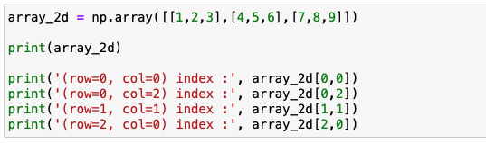 지금까진 1차원에 대한 값을 추출을 했다면, 다차원에 대한 데이터 추출을 해보겠습니다. 우선 2차원 ndarray를 생성을 합니다. 이후 동일하게 [0,0] 과 같이 인덱스를 통해서 값을 추출을 합니다.
