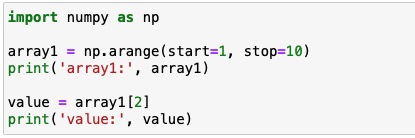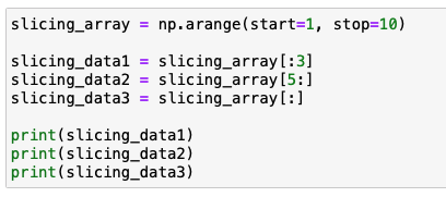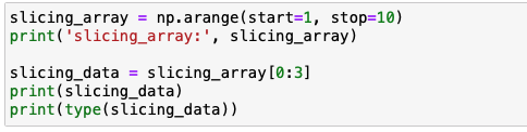 우선 슬라이싱을 하기 위한 ndarray를 생성을 합니다. 이후 [0:3] 으로 데이터 추출 수, 인덱스 0번부터 3번전까지의 데이터인 1, 2, 3 을 추출이 가능합니다.
