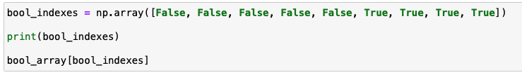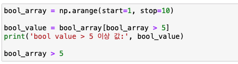 우선 1부터 9까지의 1차 배열을 만들어 줍니다. 이후 [ ] 안에 '내가 원하는 배열은 5 보다 크다' 라는 의미로 [bool_array > 5]를 입력을 하면 아래와 같이 bool_value에는 [6, 7, 8, 9] 가 반환이 됩니다.
