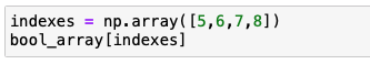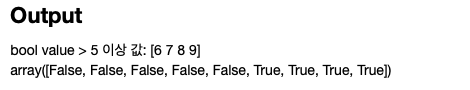 이외에 1차 배열의 값에서 > 5 보다 큰 수를 찾고 싶을때 "bool_array > 5" 로 검색을 할 경우, 5보다 아래인 데이터는 False를 5보다 큰 값은 True를 반환합니다.