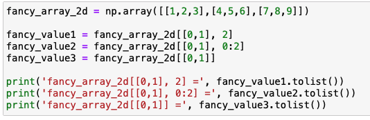 리스트와 슬라이싱을 같이쓰는 것도 동일하게 [0, 0:2] 와 [1, 0:2] 인 [[1, 2], [4, 5]] 를 반환하게 됩니다.
