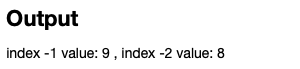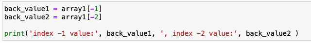 값을 추출을 하실때, [-1]을 해게되면 뒤에서 첫번째의 값을 확인 할 수있습니다. 인덱스는 기존 python과 동일합니다. [-1]의 경우 맨마지막 숫자인 9를, [-2]는 뒤에서 두번째 값인 8을 추출할 수 있습니다.
