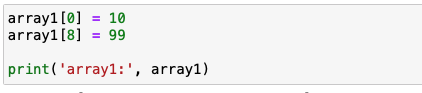 해당 위치의 데이터를 추출을 했으면, 동일한 방법을 이용해서 다른 값으로 변환도 가능합니다. 변경을 하고 싶은 데이터의 인덱스를 지정 후, 변경할 데이터를 기입하면 됩니다. 기존 [0]의 경우 1의 값을 가지고 있었으나 10으로 변경을 하고 [8]의 경우 9의 값을 가지고 있는것을 99로 변경을 할 수 있습니다.