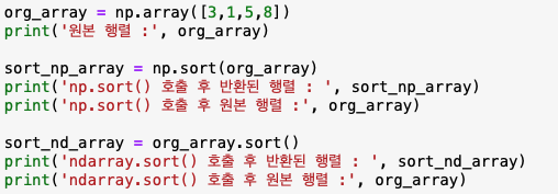 np.sort()와 ndarrary.sort()의 차이는 numpy에서 sort()를 호출하는 방식과, 행렬에서 sort()를 호출을 하는 방식의 차이가 있습니다. 정렬은 하는 목적은 둘다 동일하지만, np.sort()의 경우엔 원 행렬은 유지한 채 정렬된 행렬을 반환하지만, ndarray.sort()의 경우엔 원 행렬 자체를 정렬한 형태로 변환하고 반환 값은 None입니다.
