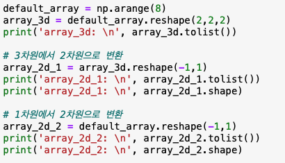 해당 함수는 reshape(-1,1)와 같은 형태로 자주 사용됩니다. reshape(-1,1)로 여러개의 row값과 반드시 1개의 col값을 가진 ndarray로 변환을 하고, 다른 ndarray를 결합하고 각각의 형태를 통일을 할 때 많이 사용을 합니다. 3차원을 2차원으로, 1차원을 2차원으로 변경도 가능합니다.