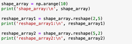 먼저 arange(10)을 사용하여 1차원 배열을 생성을 합니다. 그리고 reshape(row,col) 값을 입력을 합니다.