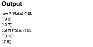 행렬이 2차원 이상의 경우엔 row, col 방향으로 정렬을 수행 할 수 있습니다.