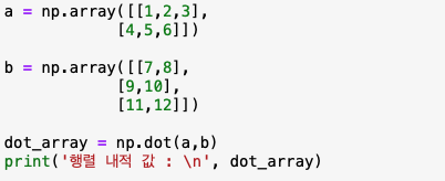 a는 [[1,2,3][4,5,6]]이라는 2_2의 2차 행렬이, b는 [[7,8][9,10][11,12]]라는 2_3의 2차 행렬이며 np.dot(a,b)를 하면 1_7+2_8+3_9 와 같이 행렬 내적을 하여 결과 값인 [[58,64][139,154]]인 2_2의 행렬로 결과 값을 받을 수 있습니다.