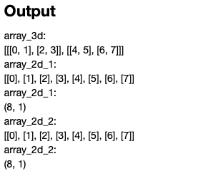 아래 예제를 통해서 알아보겠습니다. tolist()는 가독성을 위해서 사용을 했으며, 데이터를 리스트로 변환을 해줍니다. 3차원으로 만든 array_3d를 reshape(-1,1)을 사용을 하여 2차원으로 변환을 하였고, 반대로 1차원에서 2차원으로 변경을 하였습니다.