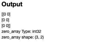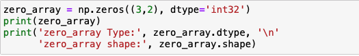 아래 예제와 같이 np.zeros((3(row),2(col)), dtype='int32(type)')을 입력을 하면 0으로 이루어진 3x2의 행렬이 생성이 됩니다.