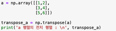 마지막으로 전치 행렬에 대해서 설명을 드리겠습니다. 전치 행렬은 transpose()를 사용을 합니다.