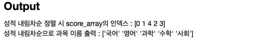 내림차순으로 인덱스 정렬을 하였으 경우, 높은 과목인 국어의 인덱스 부터 정렬이 되어 [0 1 4 2 3] 의 결과값을 받습니다.
