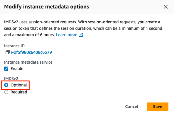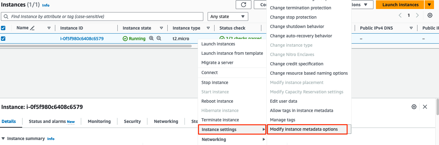 생성된 EC2 클릭 → Actions → Instance settings → Modify instance metadata options → IMDSv2를 Optional로 변경